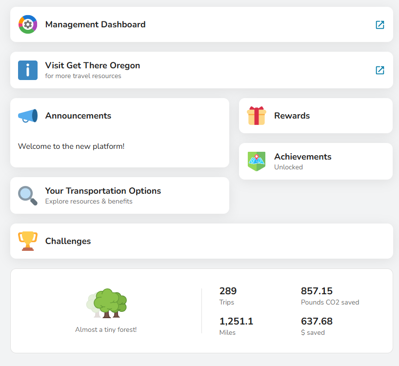 Get There Connect is Oregon’s free online trip planning, ride matching, and metrics tracking tool powered by RideAmigos. Users can create an account to plan trips, find/create carpools and vanpools, log trips and track related metrics, and participate in local rewards programs/challenges, as available.